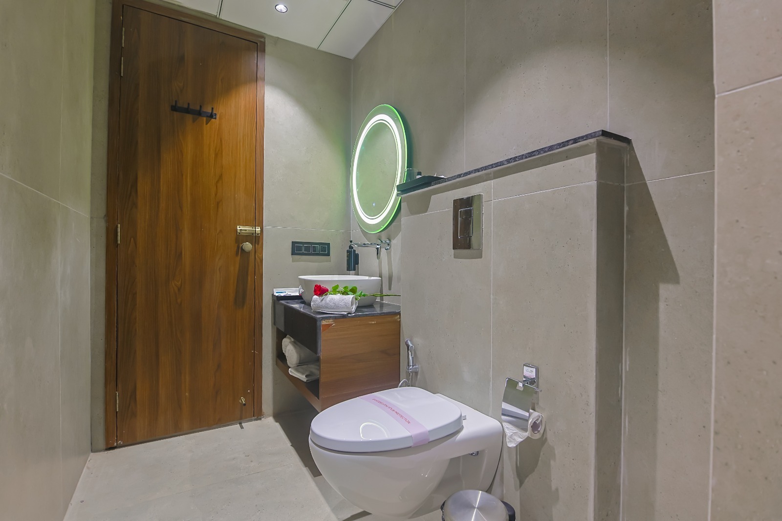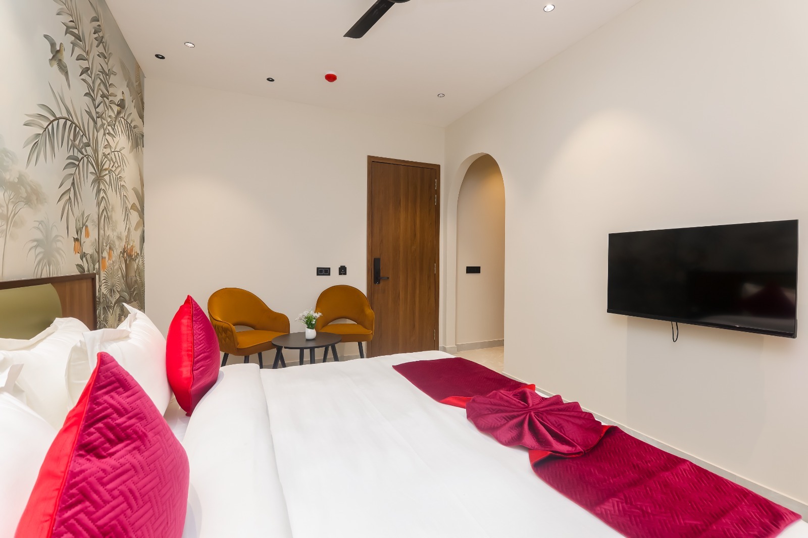 The Premium Room provides a comfortable blend of space and elegance, offering approximately 200 sq.ft of well-designed interiors. Its highlight is the City View, giving guests a pleasant, open feel. Furnished with an Extra-Large King Bed, this room also features Air Conditioning, High-Speed Wi-Fi, a Flat-Screen TV, Mini-Fridge, Electric Kettle, and a dedicated work desk. The attached private bathroom includes modern fittings and high-quality toiletries. This room is ideal for couples or small families wanting a more spacious, bright, and premium experience while staying close to the sacred Ganga Ghat.